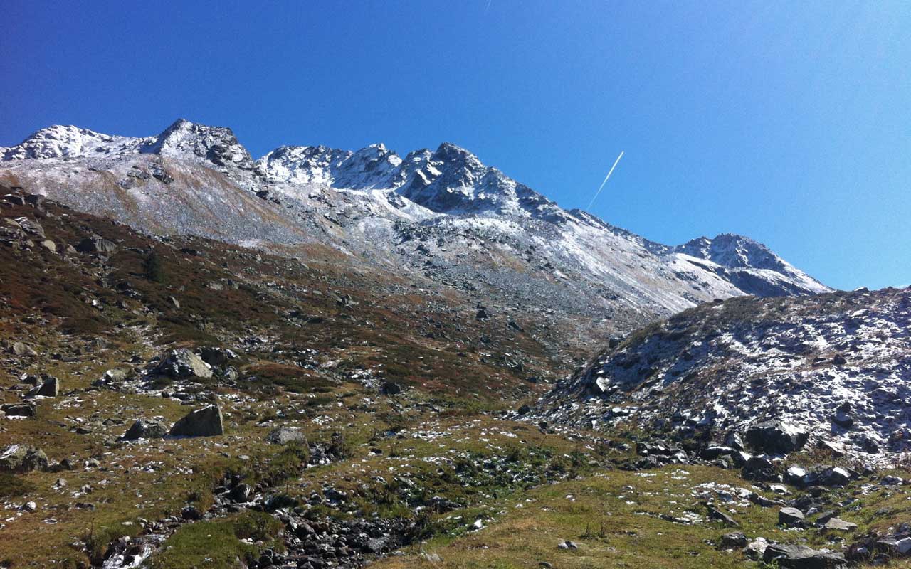 Nach der Baumgrenze zeigt sich die Alpinlandschaft von ihrer ganzen Schönheit. Strahlendblauer Himmel, gelb-braune Wiesen, von Bächen durchzogene Geröllfelder und dahinter die Berge. Einfach Hammer.